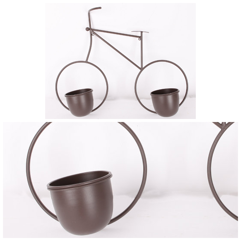 This wall-mounted bicycle-style flower rack combines functionality with aesthetic appeal. Crafted from sturdy iron and featuring two waterproof planting buckets, it offers a practical and charming solution for displaying your favorite plants while saving space.